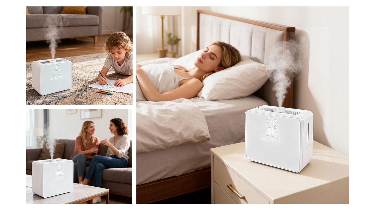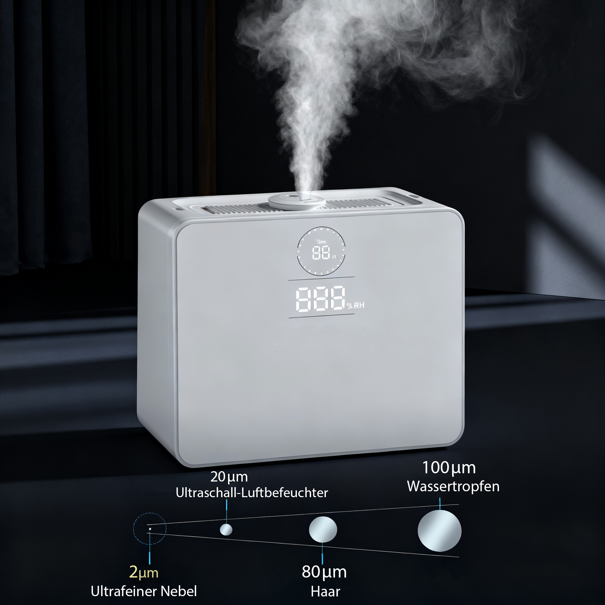 Die Ultraschalltechnologie zerstäubt Wasser in Mikrotröpfchen von nur 2 μm, die gleichmässig im Raum verteilt werden, ohne Oberflächen zu befeuchten.