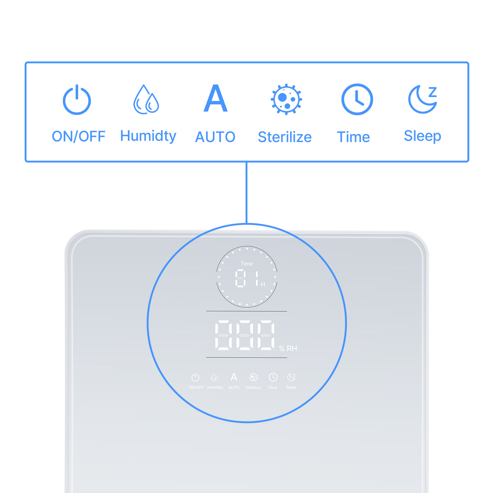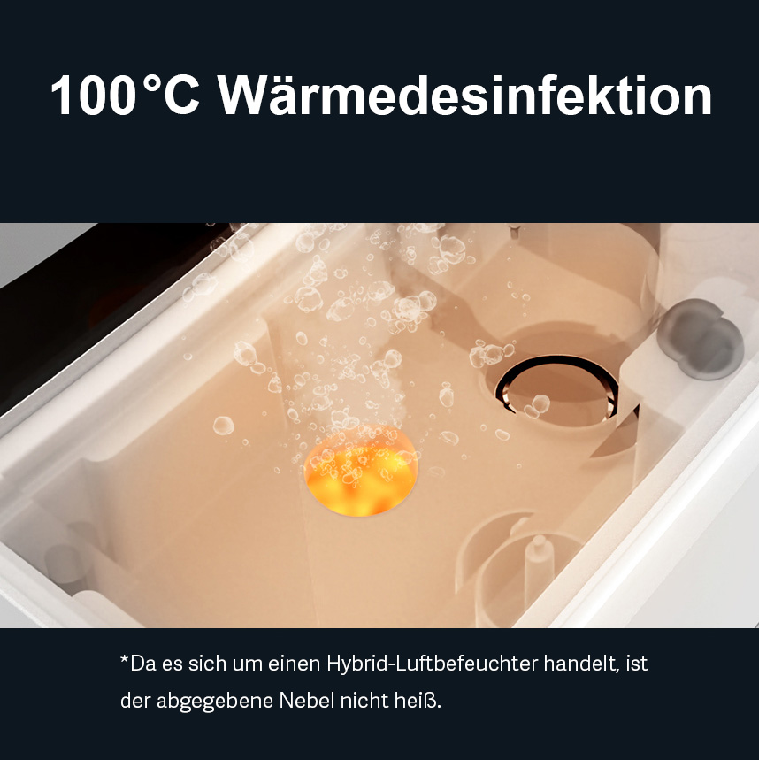 Gleichmässige und effiziente Feuchtigkeitsverteilung durch zwei rotierende Auslässe und fünf einstellbare Nebelstufen für optimalen Komfort.